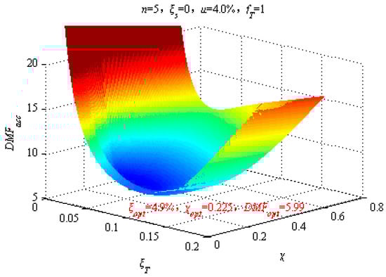 The same as Section 2.2, when the number of TMDs is 5, the MTMD mass ratio is 4.0% and , the relationship between , and is shown in Figure 6.