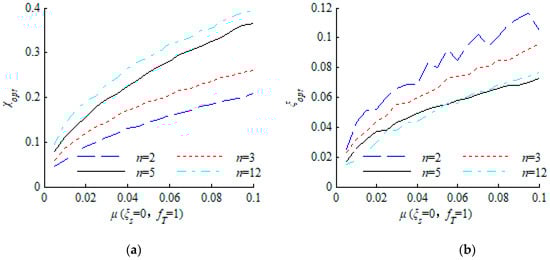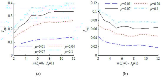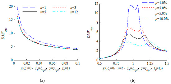 Then, it can be concluded that after the MTMD mass ratio and the number of TMDs are chosen, and can be calculated through Equation (6)–(8) or (9)–(11). To see the tendency between and , and and clearly, Equation (4) and Equation (5) are drawn in Figure 7a,b, respectively, for example. To see the tendency between and , and and clearly, Equation (4) and Equation (5) are drawn in Figure 8a,b, respectively, for example.