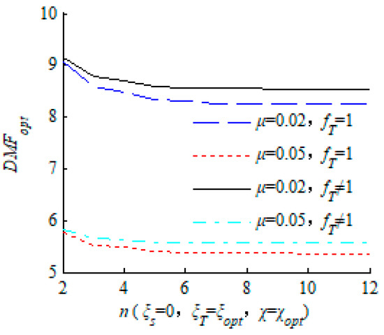 The relationship between and the number of TMDs , with different MTMD mass ratios and central frequency ratio is shown in Figure 9. In Figure 9, for different , and , the and can be calculated from Equations (4) and (5).