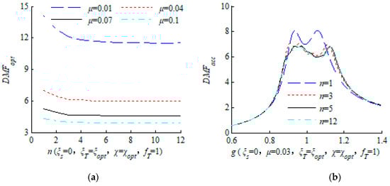In Equations (8) and (11), is also related to the MTMD mass ratio and the number of TMDs . Therefore, it is necessary to discuss the central frequency ratio , mass ratio and the number of TMDs in the MTMD system.