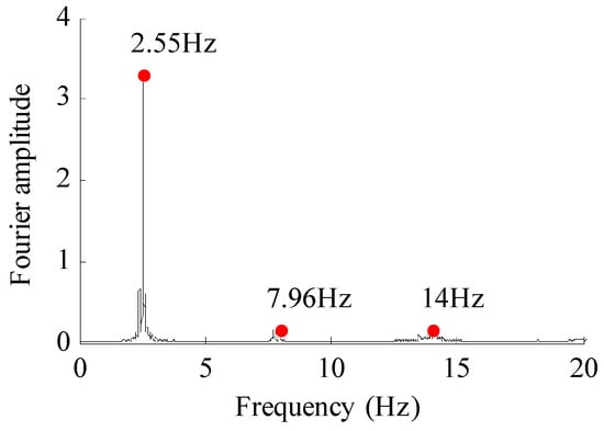 Under ambient excitation, the acceleration response of three measurement points are obtained through three acceleration sensors and are analyzed through fast Fourier transformation (FFT). The results of the three points are quite similar, and for brevity, only the result of the A2 point is shown in Figure 14.