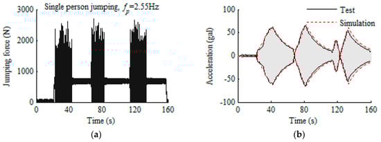 The jumping excitation comparison (a) Jumping force time history; (b) Comparison of structural acceleration response (note: “gal” means “cm/s2”.).