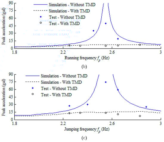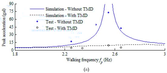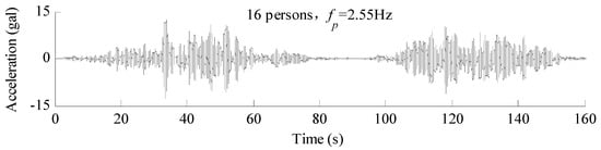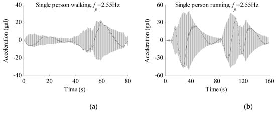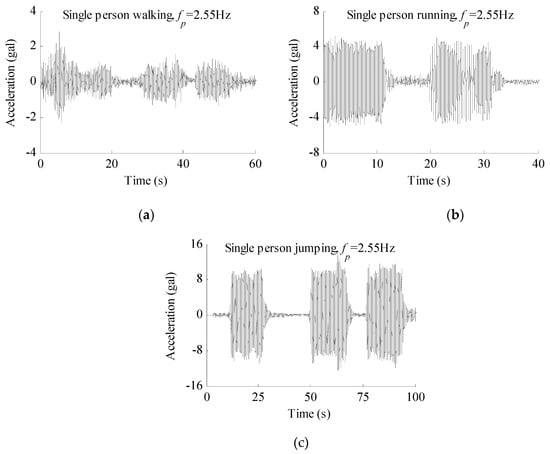 In Figure 16, the structural maximum acceleration is 22.8 gal for the walking case and 49.5 gal for the running case. In Figure 16a, the acceleration amplitude “22.8 gal” is only the response value of a single person walking. In fact, according to References [41,42,43], a 0.5 person/m2 crowd-load should be considered. Based on the equivalent flow analysis result, the walking coefficient should be multiplied by 3.2, and therefore, the structural equivalent maximum acceleration is 73.0 gal for the walking case. It can be seen that neither of the above three cases can meet the serviceability requirement.
