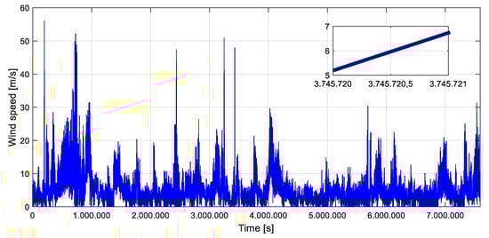 The meteorological station from which wind data measurements were collected was located in a flat terrain, with no obstacles to disturb the flow of the wind. Consequently, the logarithmic law was used to extrapolate the measured data to the hub height of 90 m of the NREL 5-MW wind turbine that has been considered for the analysis carried out in this paper. The obtained wind speed profile is illustrated in Figure 1.