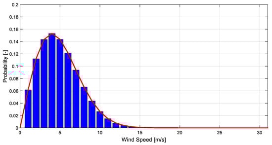 The shape and form parameters of the probabilistic distribution represented in Figure 2. are and , respectively. The calculation of the Weibull distribution of the real wind speed measurements is of great importance, since it will enable the calculation of the energy the wind turbine will produce during the time interval in which the wind speed values have been collected.