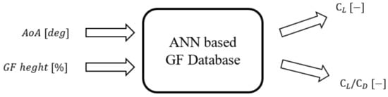 In the analysis carried out in this paper, an ANN has been trained to store the data corresponding to the effect of the GFs in the lift and drag coefficients of the DU91W(2)250 airfoil. These data were previously calculated via computational simulations by Aramendia et al. []. The Reynolds number of the simulations was set to 2 × 106 and the 3D effects behind the GFs were not been taken into account, i.e., 2D simulations were conducted. The ANN was conceived to serve as a database to its posterior access during the operation of the AGF flow control strategy. The DU91W(2)250 airfoil was present in two different stations of the NREL 5-MW reference wind turbine, located at 28.15 m and 32.25 m of the root of the WTB, respectively. Many advantages are associated with the utilization of an ANN as a database to store CFD data. First, a correct training process of the ANN enables the accurate modeling of highly non-linear shapes of the input data and storage of this as a continuous function. In contrast, traditional look-up tables would require a very large amount of data and considerably long arrays to present a result similar to that of the ANN. As a result, the management of data is considerably reduced during operation. In addition, the use of an ANN allows the performance of continuous training processes of the neural network with data measured during operation and automatic learning from real measured data. Finally, the use of ANN as a database allows simple access to the data stored in it.