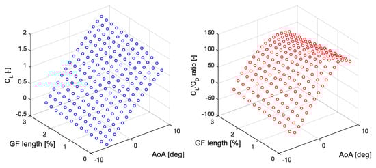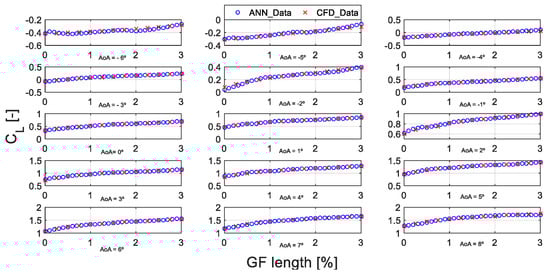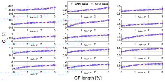 In order to evaluate the reliability of the ANN for use as the GF database during the operation of the AGF control strategy, a comparison between the input CFD data and the output data of the ANN for different values of the AoA (°) are presented in Figure 6 and Figure 7. The diagrams of Figure 6 correspond to the lift coefficient CL (-) and diagrams of Figure 7 correspond to the lift-to-drag ratio CL/CD (-).