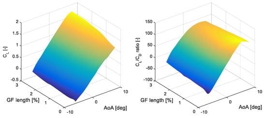 If the effect of the GFs on the aerodynamic performance of the WTBs, characterized by the lift and drag forces, is studied in detail, it is to be observed that this effect depends on the physical length of the passive flow control device, i.e., GF length (defined in % of the chord length of the airfoil in which it is located), and the AoA (°) of the incoming wind. A detailed parametric study of the effect of the GF on the lift and drag coefficients of a DU91W(2)250 airfoil was presented in the work of Aramendia et al. []. As can be observed in Table 2, the airfoil DU91W(2)250 corresponds to Stations 8 and 9 of the WTBs of the NREL 5-MW reference wind turbine.
