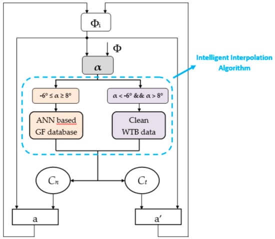 Figure 8 shows the development (remarked with a dashed blue line) introduced to the BEM algorithm presented by Fernandiz-Gamiz et al. []. This development affects the source of the lift coefficient CL (-) and the drag coefficient CD (-) values related to the DU91W(2)250 airfoils of the WTB. After the calculation of the AoA, if this value is between the range in which the GF affects the aerodynamic performance of the WTB, i.e., , access to the ANN-based GF database is performed, and the values of the optimal aerodynamic coefficients are captured. Nevertheless, if the value of the AoA is outside the range , the aerodynamic coefficient values of a clean WTB are considered.