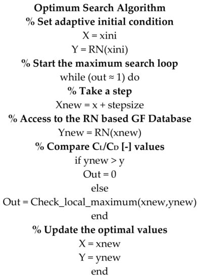 When the ANN-based GF database was accessed, in order to optimize the aerodynamic performance of the WTB, a maximum search algorithm was executed to find the value of the GF length (%) that maximizes the value of the lift-to-drag ratio CL/CD (-). Once the optimal value of the GF length (%) was found, the correspondent values of the optimal lift coefficient CL (-) and the optimal drag coefficient CD (-) were extracted. A pseudocode of the maximum search algorithm developed to find the optimal value of the GF length (%) and extract the correspondent aerodynamic coefficients is presented in Figure 9.