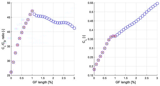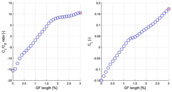 The results represented in Figure 10 and Figure 11 confirm the adequate performance of the maximum search algorithm developed for the AGF flow control strategy introduced in this paper. As already explained, in order to optimize the aerodynamic performance of the WTBs the AGF flow control strategy selects the GF length (%) that maximizes the value of the lift-to-drag ratio CL/CD (-). This value is not necessarily the one that maximizes the value of the lift coefficient CL (-), as can be observed in Figure 10. The convergence time values presented in Table 3 ensure a reasonable response time of the algorithm and prove its real-time applicability in the control system of a wind turbine. If the results illustrated in Figure 10 and Figure 11 are analyzed, it is to be noted that the adaptive initial condition technique designed for the maximum search algorithm plays an important role in the reduction of the execution time needed to find the value of the ratio CL/CD (-).