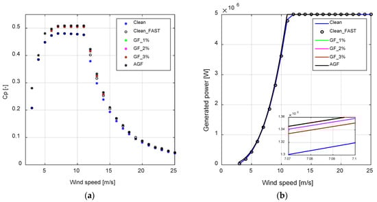 As can be observed from the diagrams in Figure 12, in comparison to the case of clean WTB (without GFs), the power coefficient CP (-) and the power curve of the wind turbine are improved with the implementation of the GFs. Furthermore, it can be noted that the performance of the passive GF is further improved with the application of the AGF control strategy, achieving an upgraded power coefficient CP (-) and power curve. Finally, the high correspondence between the power coefficient CP (-) and power curves of the case with clean WTBs calculated with BEM and the aeroelastic code FAST v7 must be noted []. This correspondence enables the validation of the use of BEM calculations to model the results of the steady operation of a wind turbine without the use of an aeroelastic code.
