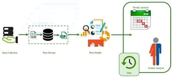 In recent years, social media has dramatically expanded in popularity around the world and became an integral part of the information ecosystem in both application and research perspectives due to its unprecedented reach to masses (i.e., users, consumers, businesses, governments, and nonprofit organizations) []. Historically, traditional data sources (i.e., survey, census) [,] are analyzed to observe human activity behavior [,], lifestyle patterns [], and gender differences [], but these data sources are considered to be more expensive both in the collection and the analysis. This, in turn, requires more processing time and results in data sparsity. Policymaking and delivery of services are closely intertwined with city planning and human mobility. However, due to the limitations highlighted above, these traditional methods are considered to be less effective in policy-making and delivery of services [].