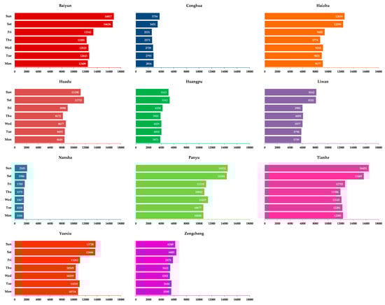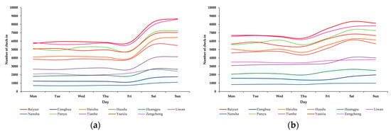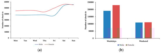 Figure 10a,b represent the gender-based weekly check-in trend in all districts of Guangzhou. The difference of check-in behavior by male and female users during Saturday and Sunday can be observed clearly and is mainly due to the change in check-in behavior by male users. Hence, the results of Figure 10a,b also justify the results of Figure 9a,b.