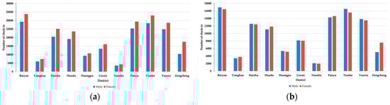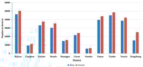 Figure 9a,b show the gender wise check-in distribution in Guangzhou during weekdays and weekend. Meanwhile, more check-ins are made by female users during the weekdays, as shown in Figure 9a. Surprisingly, more check-ins are made by male users in most of the districts (Baiyun, Haizhu, Huangpu, Liwan, Nansha, Tianhe, and Yuexiu) in Guangzhou as compared to female users during the weekend.