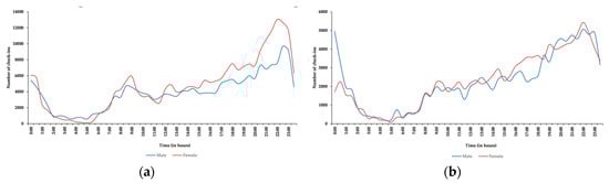 To study the check-in trend in Guangzhou, it is vital to observe the gender-based check-in trend through weekdays and weekend. In Figure 6a,b, the growing activity trend can be witnessed through the weekdays from 05:30–09:30 and 17:00–22:30. However, an increasing check-in trend was also observed throughout the weekend from 08:00–22:30. Furthermore, it can also be observed that the frequency of use from female users is a bit steady with a minor rise during the weekend in comparison to male users. Comparatively, the check-in frequency of male users differs a lot during weekdays and weekends. Furthermore, it is observed that, during the whole week, check-in frequency increases from 20:00–23:59. Additionally, during the weekend, the check-in frequency of male users peaks between 19:00–23:00 as compared to female users.