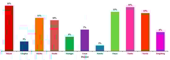 The dataset mined in this study was obtained from Sina Weibo. It covered the Guangzhou area for the period between January and May 2016, which contains 852,560 check-ins from 20,634 users. Guangzhou is considered to be one of the most attractive destinations in China due to its heterogeneous population and job opportunities regarding demographic characteristics [], socioeconomic status [,], and place of origin []. Guangzhou, China (longitude from 112°57′ to 114°3′E and latitude from 22°26′ to 23°56′N []) is located on the south coast of Pearl River Delta (PRD) with a 14.5 million population [] and had a total area of 7434.4 km2 []. In 2015, Guangzhou was divided into 11 districts (Baiyun, Conghua, Haizhu, Huadu, Huangpu, Liwan, Nansha, Panyu, and Zengcheng) []. Six of the districts (Baiyun, Huangpu, Haizhu, Liwan, Tianhe, and Yuexiu) are denoted as the center of the city [,], as shown in Figure 1.