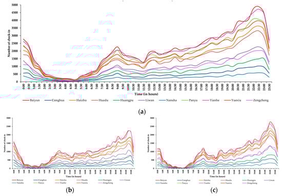 Furthermore, we analyzed the Weibo dataset to observe a gender-based check-in trend during 24 hours in all districts of Guangzhou and is presented in Figure 11a,b,c. Figure 11a presents the day-to-day check-in trend in Guangzhou. An increase in check-in trend is observed from 07:00 AM to 09:00 AM. However, a decrease in the check-in trend is observed from 09:00 to 11:30. Furthermore, It can also be observed that the check-in trend starts to rise again at 11:30 AM and continues to rise until 22:30, as shown in Figure 11b,c.