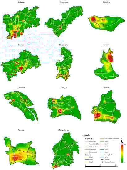In the current study, the geo-location-based check-in dataset, which comes from Weibo, is utilized and analyzed the check-in density by using KDE. Figure 3a shows the main highways, water channels, and vegetation of Guangzhou, where Figure 3b presents the overall check-in density in Guangzhou. However, by comparing Figure 3a,b, it can be observed that the city center has a relatively dense check-in distribution. Generally, it is considered that more and more people prefer to live near the communities where they have easy access to services, i.e., transport, healthcare, and entertainment [,]. Even from the current study, high check-in density is found nearby subways and highways. Historically, the density of the Guangzhou city population rose abruptly, and the attraction of the port mainly influenced population distribution. After the reforms in China, suburban areas were covered by mega-factories, which attracted more people from the areas outside of Guangzhou for the development of mega-factories. However, a small proportion of these people preferred to live in suburban areas while the majority preferred to reside within the city center [,,]. Hence, the result of the current study also shows the same pattern of population density in Guangzhou.