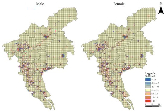 Moreover, Figure 13 shows the average spatial change tendencies of the parameter estimates for check-ins, which are pivotal and focus factors in this article. This article also manually sets zero as a threshold to distinguish between the positive and negative effects. This shows the general tendencies and nuances of check-ins by male and female users. The effects of check-ins by the female users in the city center are greater than 0.5 StdResid as compared to male. The greater StdResid means that check-in frequency is high among the female users.