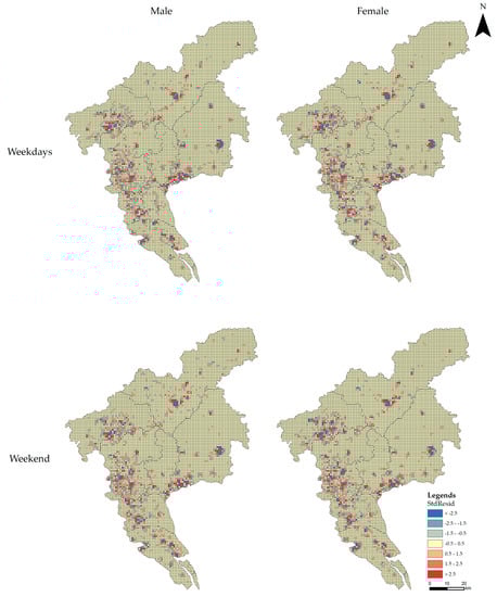 The GWR results for male and female during weekdays and weekends are presented in Table 1. All selected variables are significant at the 1% level. The R2 values are 0.9288 and 0.9157, which denote that the selected variables can explain 92.8% and 91.5% of the variation in the check-in on weekdays and weekend, with optimal spatiotemporal bandwidths of 0.300 and 0.301 for weekdays and weekend, respectively. The variation trends for male and female during weekdays vary due to the higher number of check-ins by a female as compared to males and can be observed in Figure 14. The variation trends for males and females during the weekend are roughly the same due to the increased number of check-ins by the male as compared to weekdays and can be observed in Figure 14.