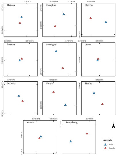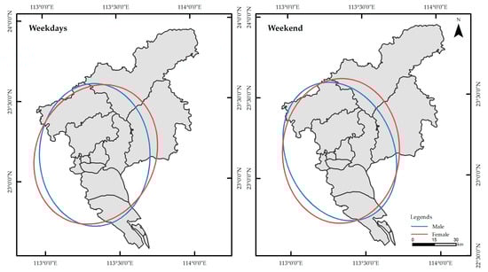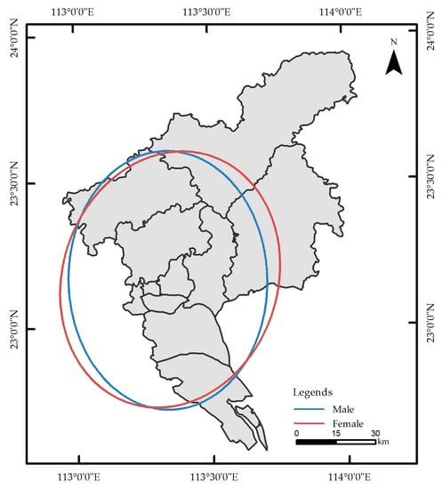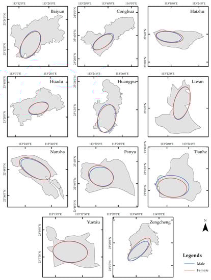 The overall spatial pattern changes of check-ins by males and females across Guangzhou were determined through a standard deviational ellipse analysis and is plotted in Figure 15, which shows the overall spatial pattern of check-in within the city by males and females. In this case, the major axis indicates the direction and the minor axis indicates the range of the data distribution.