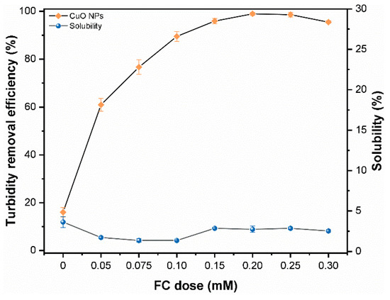 Effect of various FC (0–0.30 mM) dose on turbidity removal efficiency and solubility of CuO NPs (30 mg/L) at pH 9.