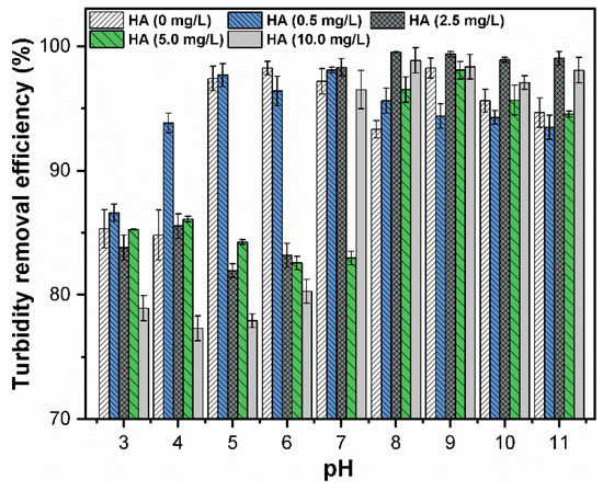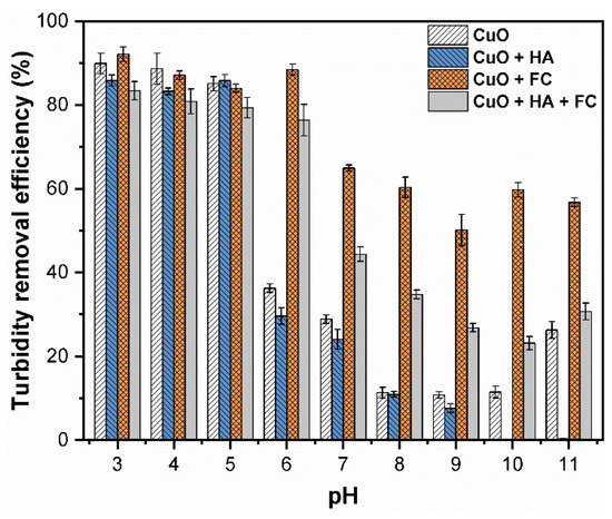 Turbidity removal efficiency of CuO NPs (30 mg/L) under different pH (3–11) values of FC (0.05 mM) and HA (10 mg/L).