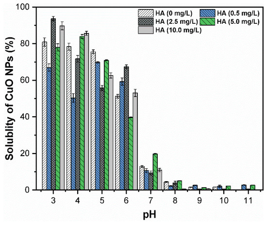Solubility of CuO NPs (30 mg/L) under various pH (3–11) values and concentrations of HA (0, 0.5, 2.5, 5, and 10 mg/L) at FC (0.2 mM) dosage.