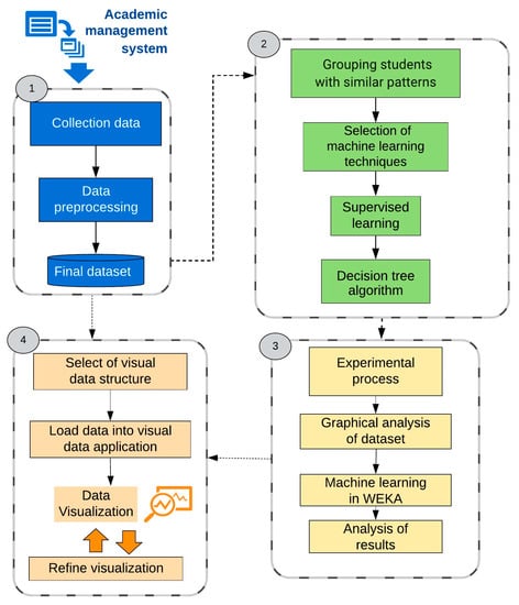 The main purpose of data visualization is to present all the characteristics of the dataset through graphical representations. The visualization of data in a graphical format constitutes an element of support, so that the results of a process of data analysis are shown in an intuitive way for students, teachers or educational administrators. The data visualization process can be described in general terms in the following steps: obtain and debug the data; select the data visualization structure; load the data into the selected application; display the data in dashboards; and, finally, refine the process of visualization [32].