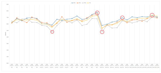 In Figure 3, some interesting deviations are highlighted with a red circle, with first highly descending peaks and then two others as highly ascending. It is worthwhile studying what these situations might be due to. At first, it seems the explanations could have to do with students attaining good grades in their first tests and then their grades deteriorating as the course advances. That might be the reason why PG3 decreased and vice versa with the last two red circles that show that the students at the end studied harder to get a better FG. In addition, there is an important factor that, since the semester 2018-1, the percentage weightings of each PG changed: