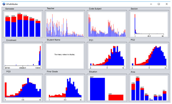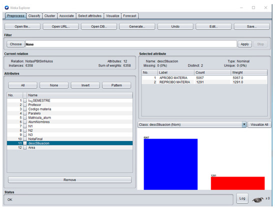 In the data preprocessing phase, duplicate records and null value records in components PG1, PG2, and PG3 were eliminated. In addition, in this phase the subjects of the knowledge areas Economy—Administration and General Education—Languages were eliminated. Another important task was executing a process to anonymizing the data that was carried out to comply with international data protection standards. This process consisted of eliminating or substituting the personal data fields (identification number, names, and surnames) of both students and teachers.
