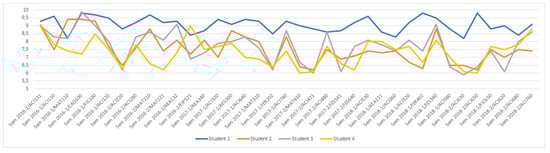 In engineering degrees, it is not common to find regular students, that is to say that they pass consecutively all the subjects of various academic levels planned in the curriculum. With the historical dataset of student grades, a combination of variables was performed in order to obtain a group of students that have common attributes and on which some type of analysis can be carried out before applying machine learning algorithms. After combining student grades, subjects, and academic years, only four regular students were identified who have taken and passed the same subjects up to 6th semester; this is 37 subjects, which is equivalent to 62% of the total subjects (68) of the curriculum. As previously explained, 19 subjects were eliminated from certain knowledge areas of transversal training. Figure 6 shows the variation of the FG of the four students over six semesters and 19 subjects.
