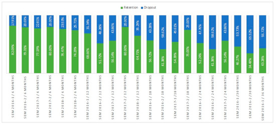 After the preliminary analysis, it became imperative to analyze the student retention and dropout values of the degree under study. Figure 7 shows the student retention and dropout rates accumulated for each cohort that began their studies in the academic periods we analyzed in this work. Figure 7 shows the retention and dropout rates at 6, 12, 18, 24, 30, and 36 months. When the rates are accumulated, it was observed that the cohort that began their studies in the semester 2016-1 had 29 students remaining after three years. The educational authorities must focus on these statistical data in order to implement actions that allow the dropout rate to be reduced.