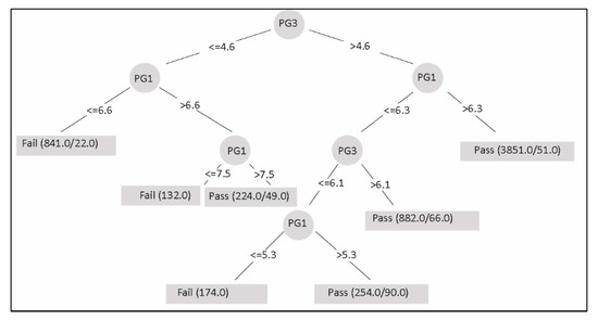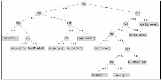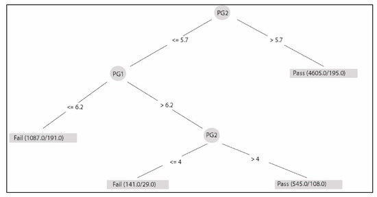 What is really striking in these last experiments is the creation of clear and coherent decision trees and, consequently, the usefulness of the acquired decision rules. This allows a study on the PGs to determine which are the most decisive. For example, in Figure 10, the root of the decision tree shows that when PG2 is lower or equal than 5.7 and PG1 greater than 6.2, then the student will either fail if PG2 is lower than or equal to 4.0, or otherwise pass. With this information, teachers can build action plans of individualized learning for students classified under this rule. Figure 11 shows a similar decision tree, slightly more complex, where we are able to find patterns and rule analogously to the previous example of Figure 10; the difference in this test is that PG2 was removed, and we used the PGs PG1 and PG3.