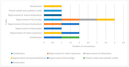 In instances of negative or ambivalent relationships, “Improvement of knowledge” was the code with the greatest number of concurrences, with a total of four, followed by “Improvement of tourist destinations,” “Improved visitor experience,” and “Gamification” with two each (Figure 4). Considering these results, the bibliographic analysis of this negative grouping focused on two aspects: the geographical and temporal disconnections that the user may suffer when AR and VR are applied to urban cultural heritage; and the trivialization of the tourism process in terms of improving knowledge, information, and the visitor’s experience.