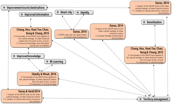 Within the group that manifested a positive relationship with AR and VR, the codes “Territory management” and “Improvement of knowledge” represented the highest number of concurrences, with a total of seven, followed by “Improvement of information,” with six intersections, and “M-learning,” with five (Figure 3). In light of this result, together with the remaining codes and concurrences in this set, a bibliographical analysis of the texts was developed that focused on the opinions and assessments of scientists concerning the effects of AR and VR on cultural heritage in terms of access to information and the new forms of knowledge generated with these technologies, especially in the case of M-Learning and the novel opportunities that AR and VR offer to touristic management of cultural heritage.
