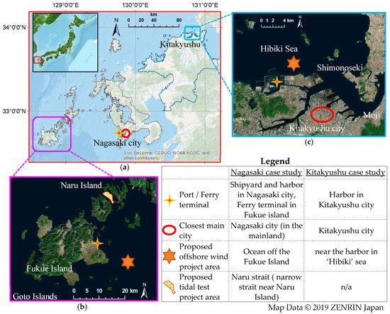 Location of Nagasaki and Kitakyushu MRE development sites in Southern Japan: (a) Location of two case studies; (b) Fukue and Naru Islands (in Goto Islands) in Nagasaki case study; (c) Kitakyushu city, Moji, and Shimonoseki area in Kitakyushu case study.
