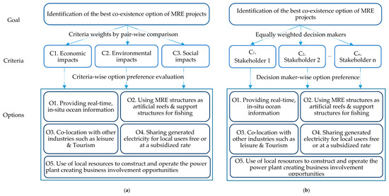 From the key stakeholder interviews, we identified that most of the considered co-existence options have not been used similarly, even in other contexts. Hence, the potential interactions and impacts were still unknown, making direct quantitative evaluation unreliable. Instead, the preference was evaluated based on perceived potential impacts identified during key stakeholder interviews. A broader set of criteria, i.e., economic impacts, environmental impacts, and stakeholder engagement and other social impacts, was selected as the preference decision criteria in the decision hierarchy shown in Figure 2a. The individual stakeholder-wise decisions to aggregate to a group decision were combined using the equally weighted decision makers approach, where individual decision makers of the considered group are considered as equally weighted decision criteria according to the DS-AHP group decision methodology [31] (Figure 2b).