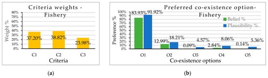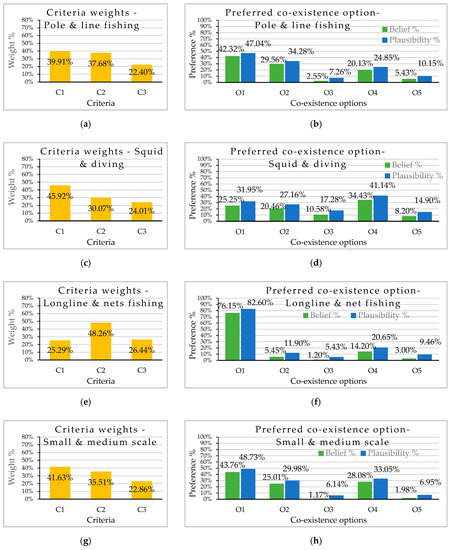 The next step in the co-existence option evaluation involved using the results of MCA with the DS-AHP decision making model according to the selected decision hierarchy (Figure 2) to identify the optimal solution. Figure 3 indicates the criteria weights (obtained by pair-wise comparison as in AHP method) of the selected criteria (in the left column), and the final belief and plausibility levels of support for the considered co-existence options (in the right column) for both case study areas. The responses were grouped considering the prominence assigned to the stakeholder group as well as the unique characteristics of their responses. Respondents representing the local fisheries assigned a higher weight to economic and environmental impacts (C1 and C2, respectively) than the social impacts (C3) (Figure 3a). The fisheries are the main stakeholder group who frequently require oceanographic information for their daily industrial activities. Interviews with fishery unions indicated the value of subsea information for estimating fish stock, fishing ground, viable catch, and the safety of marine activities. All these factors support their preference of considering oceanographic information as the best option (Figure 3b). Even though they were interested in the fifth option, fishers also raised the question about the real potential of being involved with the MRE project developments and operation, because they have a better understanding of what is required to work in offshore conditions based on their experience. Interviews with fishers showed that fishing vessels can be used for logistic purposes during the environmental impact assessment phase and maintenance phase of the power farm. The potential of recruiting local fishers for monitoring purposes of the power plant was also mentioned. However, fishery union leaders identified that the vessels used for local fishing may not be suitable for MRE projects and the ageing fishery community may not be willing to accept new challenges related to MRE projects. However, this type of interaction with fishery and the MRE industry may attract the younger generation to the fishery industry. In addition to the above factors, the low weight assigned to the social impacts contributed to not selecting the fifth option as a preferred option. The second best alternative for fishers was the second option; however, its preference level was significantly lower than that for the first option. Fishers identified that they can benefit from the artificial reef effects, which have a spillover effect on the surrounding fishing grounds. Fishers indicated that they can reduce costs related to their fishing gear setups (such as fixed nets) if they receive structural support from the MRE structures. The value of real-time in-situ ocean information was again highlighted when the fishers discussed their fishing methods and fishing gear, such as the ability of local fishers to protect their fixed net setups, aquaculture setups, etc., in the event of a sudden ocean currents, commonly known as Kyucho in Japan [58,59]. Another advantage of in-situ ocean information is the ability of fishers to predict the ocean conditions and decide if the fishing gear is suitable before travelling to the area. Further analysis of fisheries preference is discussed in the next section due to their importance to the stakeholder group among all other stakeholders as well as their unique decision behavior.