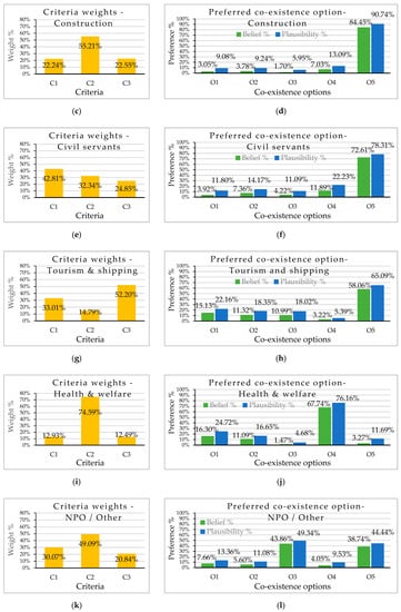 Stakeholder group-wise preference decision (a) average criteria weights and (b) option preference of fisheries; (c) average criteria weights and (d) option preference of construction sector respondents; (e) average criteria weights and (f) option preference of civil servants; (g) average criteria weights and (h) option preference of tourism & shipping industry respondents; (i) average criteria weights and (j) option preference of health and welfare sector respondents; (k) average criteria weights and (l) option preference of NPO and other respondents.