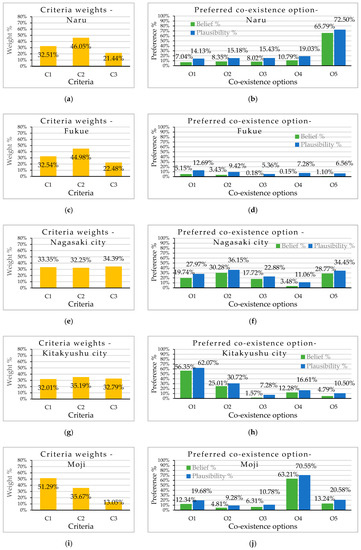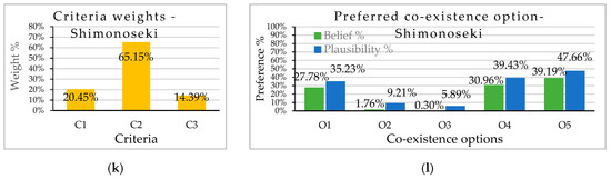 Case study area-wise preference decision (a) average criteria weights and (b) option preference of respondents from Naru; (c) average criteria weights and (d) option preference of respondents from Fukue; (e) average criteria weights and (f) option preference of respondents from Nagasaki city; (g) average criteria weights and (h) option preference of respondents from Kitakyushu city; (i) average criteria weights and (j) option preference of respondents from Moji; (k) average criteria weights and (l) option preference of respondents from Shimonoseki.