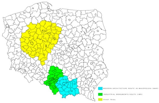 One of the tools supporting the preservation of the cultural heritage and sustainable development of the areas connected with it is the cultural route. The cultural route is a mapped out and marked material route, which connects heritage organisations, sites, and places that are selected according to a set thematic criterion, which constitute a unique and representative example illustrating the broadly understood cultural heritage of a region, community, ethnic group, minority, or nation [,]. Through the presentation of the material heritage, the route enables discovering, understanding, and popularising the intangible heritage, which treats both of these areas as an inseparable whole []. Nowadays, cultural routes are considered as an important step in the development of the concept of cultural heritage and in the recognition of its diversity [].