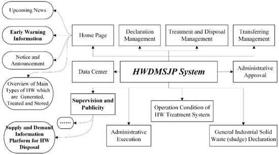 To strengthen the monitoring and management of HW, Jiangsu Province has developed a dynamic HW management system (Hazardous Waste Dynamic Management System of Jiangsu Province, HWDMSJP) based on big data and the Internet of Things (IoT) technology. Main modules are listed as shown in Figure 3, though access authority of each module differs from entities and the local environmental protection administrative department. The system uses a data-driven approach to install the IoT real-time monitoring equipment in HW vehicles and collect data on waste information, geographic location as well as images and video data over a period of 24 h. These data are subsequently sent to the data center over a wireless network for further storage and processing.