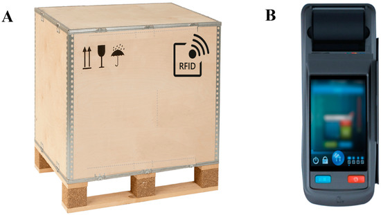 Example images of equipment. (A) Standard box and radio frequency identification tag, and (B) personal digital assistant.