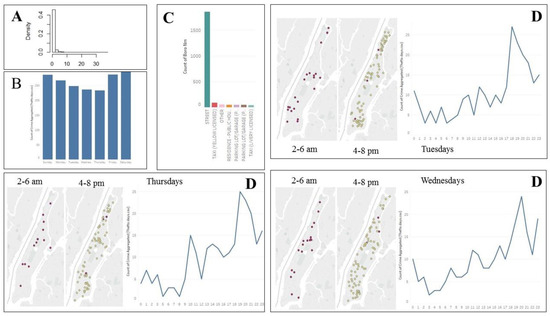 (A). Histogram of restaurants. The data is strongly right-skewed, with the most of values equal to zeros. (B). When do thefts happen? The graph shows a slight, although not very significant, increase in theft rates on Fridays, Saturdays, and Sundays. (C). Where do thefts happen? Almost all thefts from motor vehicles in Manhattan happen on the street. (D). Where and when thefts happen: Identifying patterns. The temporal distribution (in terms of crime per hour) and the spatial distribution of thefts from motor vehicles reveal a common pattern in theft location and time on Tuesdays, Wednesday, and Thursdays. However, we do not observe any pattern for other weekdays.