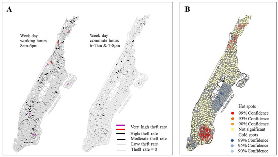 (A). Theft rates for street segments within different time ranges. The maps show that thefts from motor vehicles “move” within Manhattan depending on time, while the intensity of theft is different depending on human activities. (B). Hot spot analysis of thefts from motor vehicles. Significant theft hot spots (with 90–95–99% confidence level) are found in the East Village, Washington Heights, and Inwood neighborhoods, whereas significant cold spots (with 90–95–99% confidence level) are located in the Upper East Side and Financial District of Manhattan, NY.