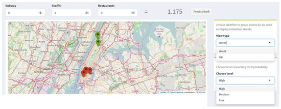 Using Shiny package for R, we developed the prototype of the application of our research results for safer parking that can be used by city dwellers, police, and insurance companies (Figure 3). City dwellers can find safety information for the selected street segment for the available parking. The developed Android App would take users’ provided street address or a current location into account and provide information about the parking safety in that location. It will also guide users to safe parking streets nearby. Police officers can use the application to allocate forces in risky areas. Insurance companies can tailor insurance prices for different cases based on users’ parking behavior. For instance, if a client lives and parks his motor vehicle on weekday nights and weekend days in Upper East Side, his motor vehicle is safe. If he works at daytime during weekdays and parks his vehicle close to his office in Midtown, he is safe too, as no significant hot spots of thefts are identified here. However, if he drives on weekend nights to East Village and parks his car there, this is where the trouble begins, as this area is identified as a hot spot of thefts from motor vehicles (with 99–95% confidence). Thus, an insurance company can offer a client the price regarding his parking behavior and locations during the week.