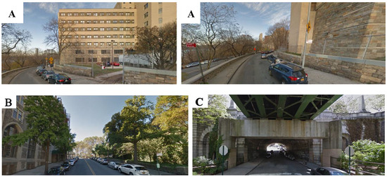 (A). Street segments with the highest theft rate in Manhattan: Department of Vascular Surgery. Urban reasons of unsafety: Lack of natural surveillance (no “eyes on the street”), nearest windows are far, fence is not inter-visible, and blind wall (wall with no windows or doors). (B) Street segments with the highest theft rate in Manhattan: Morningside Church & Sakura park. Urban reasons of unsafety: Pedestrians rarely use this space, no natural surveillance (almost no observation from windows, no entrance doors) with a church on one side and park on another. (C). Street segment with the third highest theft rate in Manhattan: West 138th Street. Urban reasons of unsafety: No natural surveillance, no lighting, no pedestrian flows, no closed-circuit television (CCTV) cameras, etc. Nothing meets CPTED (Crime Prevention Through Environmental Design) requirements for safety and security. Moreover, there is a sign in this tunnel permitting parking, and therefore, contributing to the availability of motor vehicles as targets for theft.