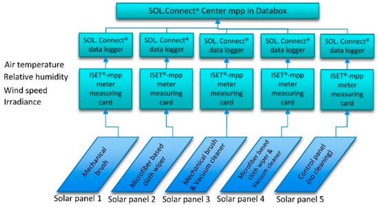 The experimental block diagram of this study is shown in Figure 2 in a simplified manner. The five modules utilized in this study are thin-film type. During the experiments, the five PV modules were connected to the SOL.Connect® measurement system, which integrates the ISET®-mpp meter measuring board as well. The PV modules are operated in MPP and are measured simultaneously under identical conditions. The measurement data are collected by the SOL.Connect® data logger. Therefore, each PV module is monitored separately.